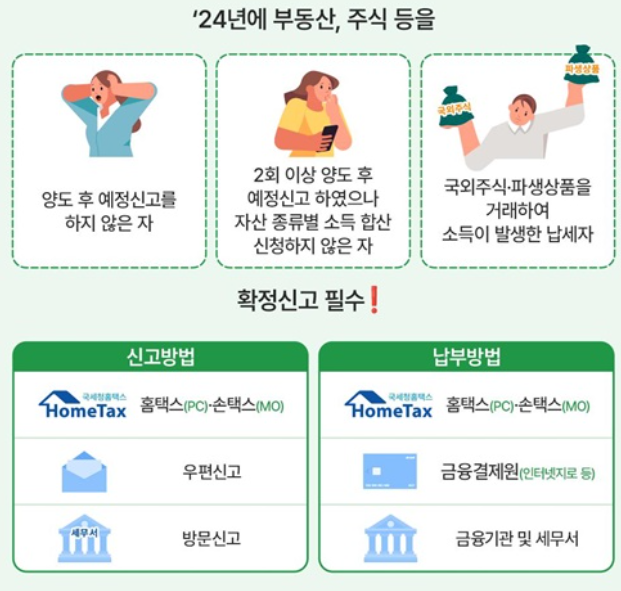 2025년의 양도소득세 신고는 6월 2일(월)까지입니다. 원칙은 5월 31일이지만, 주말이 겹치면 그 다음 평일까지 연장됩니다. 신고는 아래의 방법으로 가능합니다.